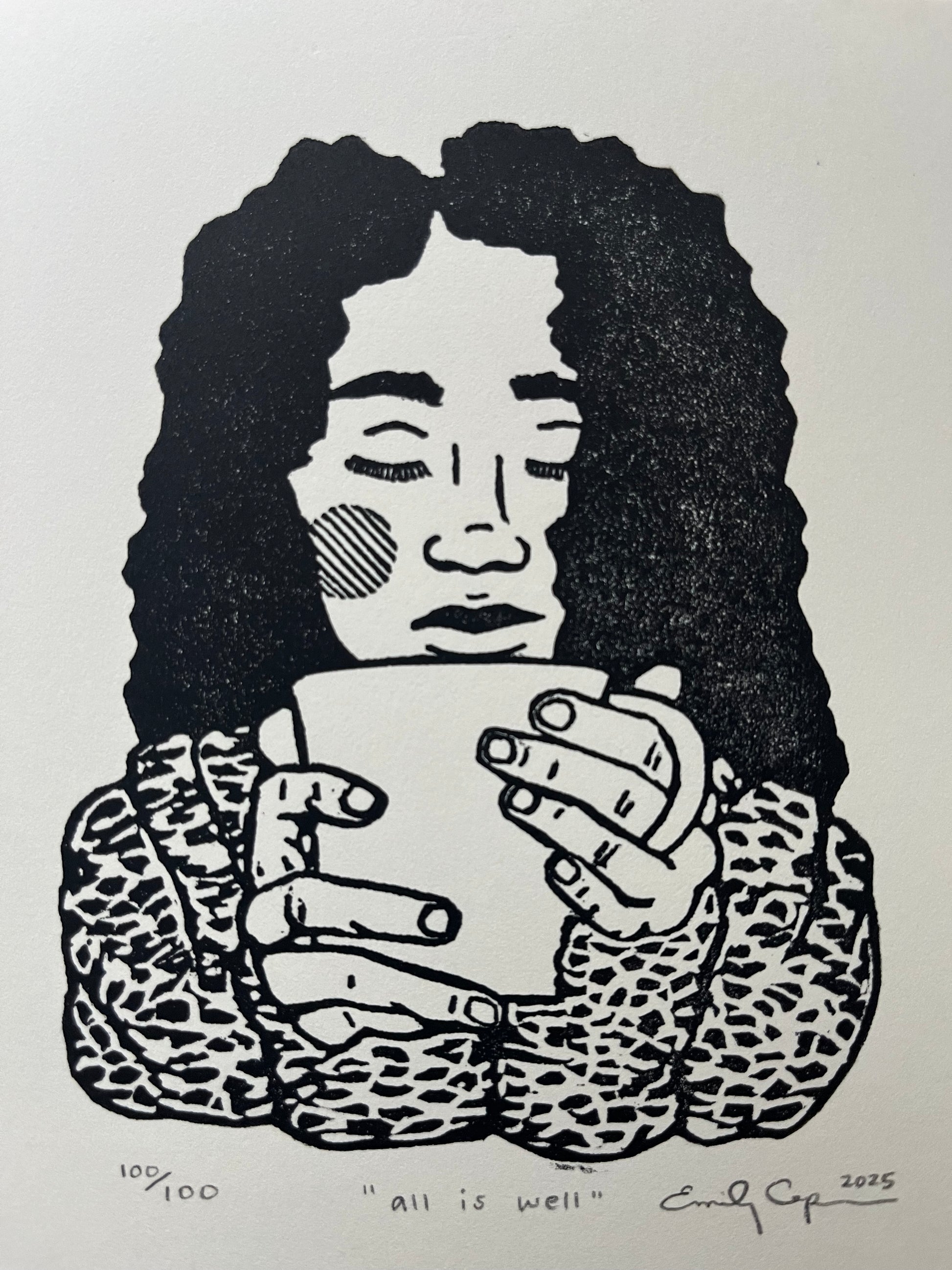“All is well” limited edition linoleum block print - tea lovers, coffee lovers, linocut