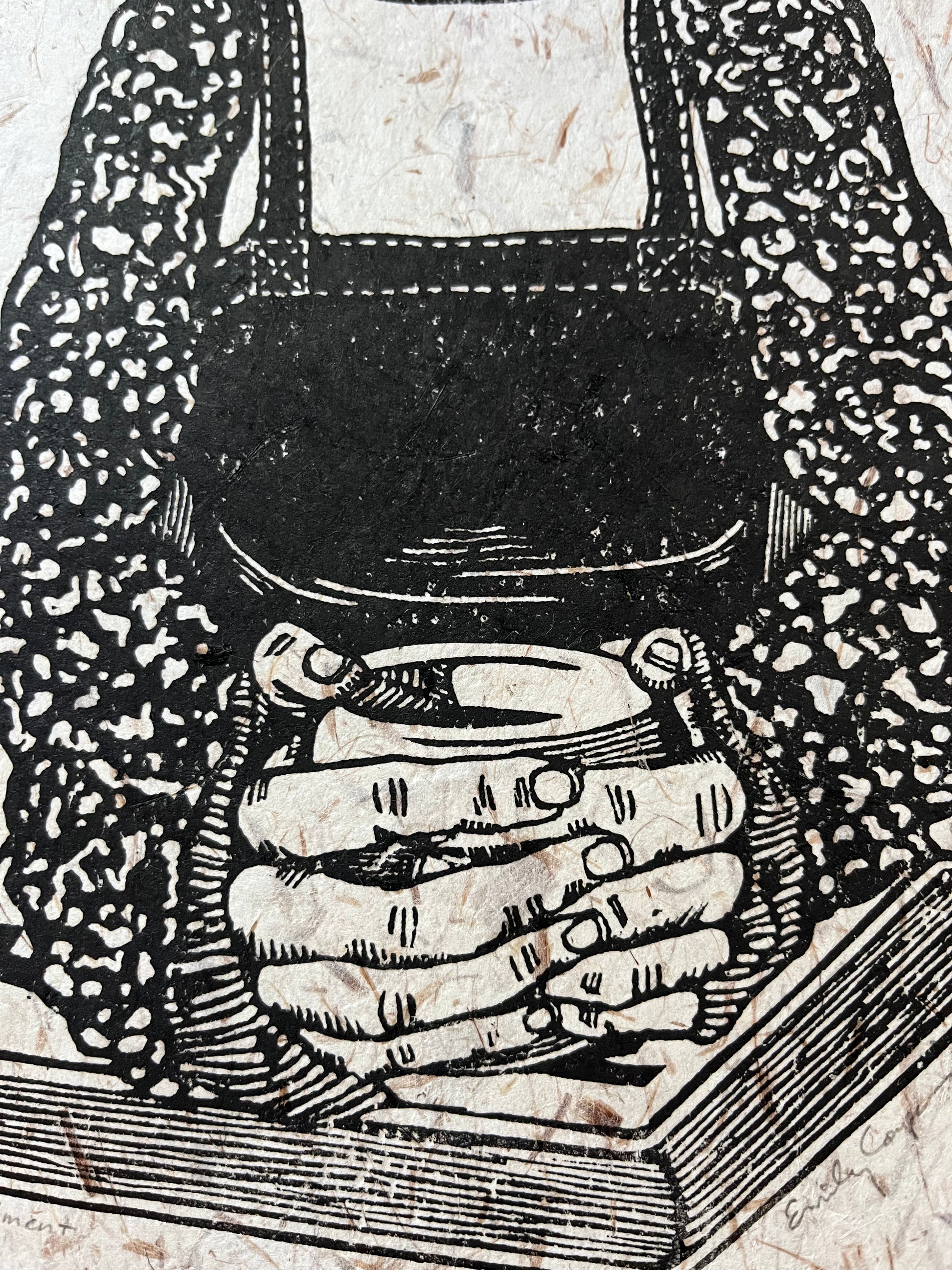 This is an open edition print featuring the hands of a person holding a coffee mug. It is printed from a hand-carved linoleum block with the use of an etching press. The paper is handmade iris leaf paper made by a papermaker in Maine. Each print measures approximately 8"x10" but may not be exact due to the nature of handmade papermaking. There may be subtle differences in ink coverage compared to what is seen on the product image. Each print is unique as it is made by hand and not machine.