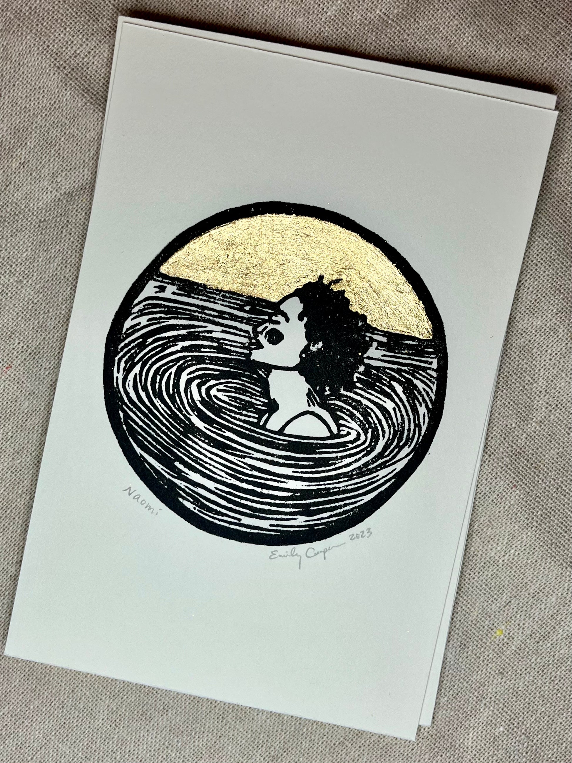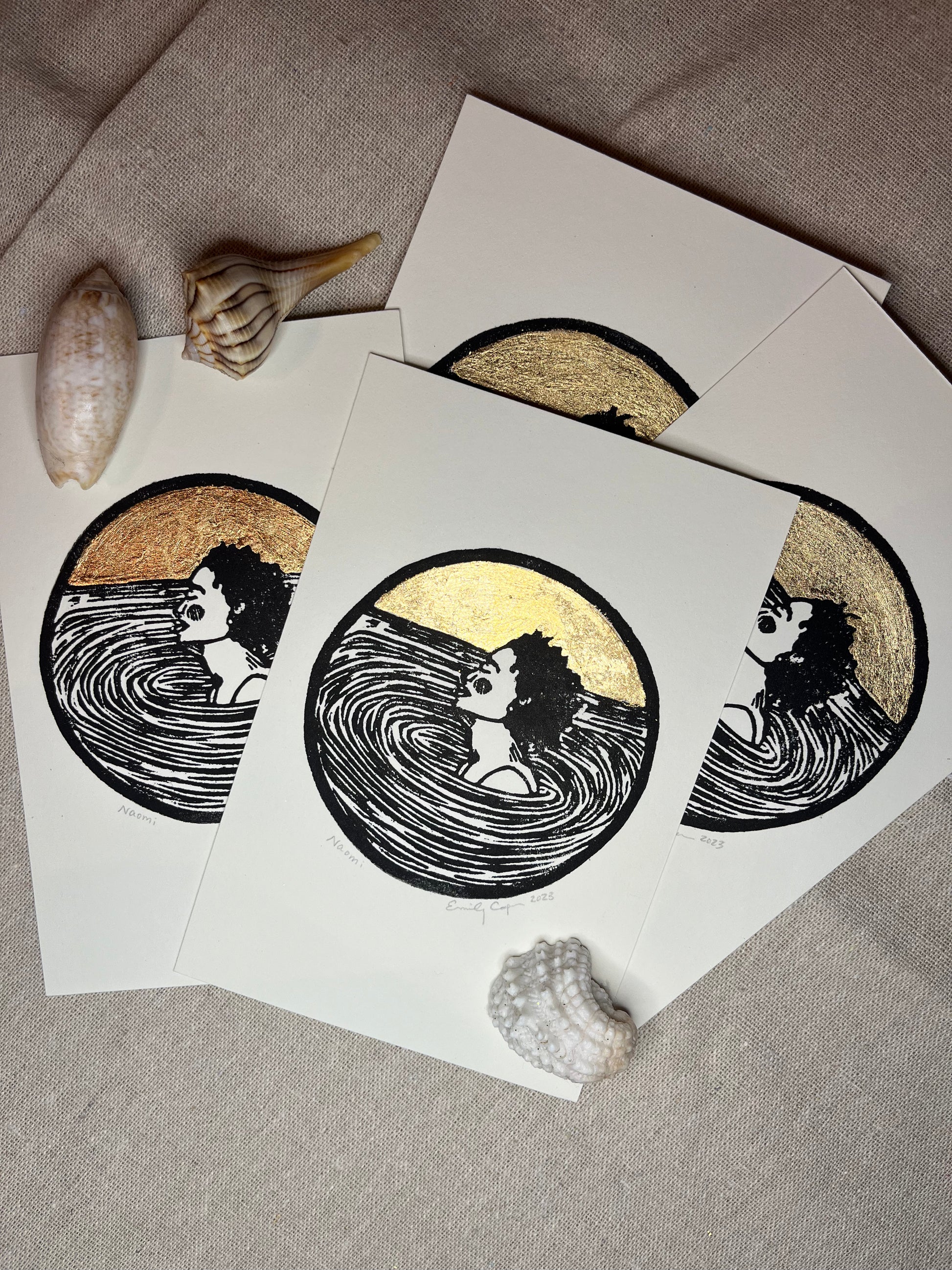 "Naomi" Individual Gold-Leafed 4"x6" linoleum block print