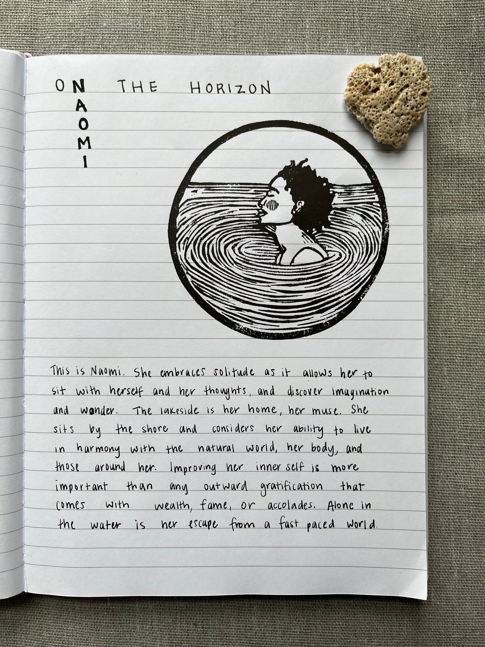 This is Naomi. She embraces solitude as it allows her to sit with herself and her thoughts, and discover imagination and wonder. The lakeside is her home, her muse. She sits by the shore and considers her ability to live in harmony with the natural world, her body, and those around her. Improving her inner self is more important than any outward gratification that comes with wealth, fame, or accolades. Alone in the water is her escape from a fast paced world.