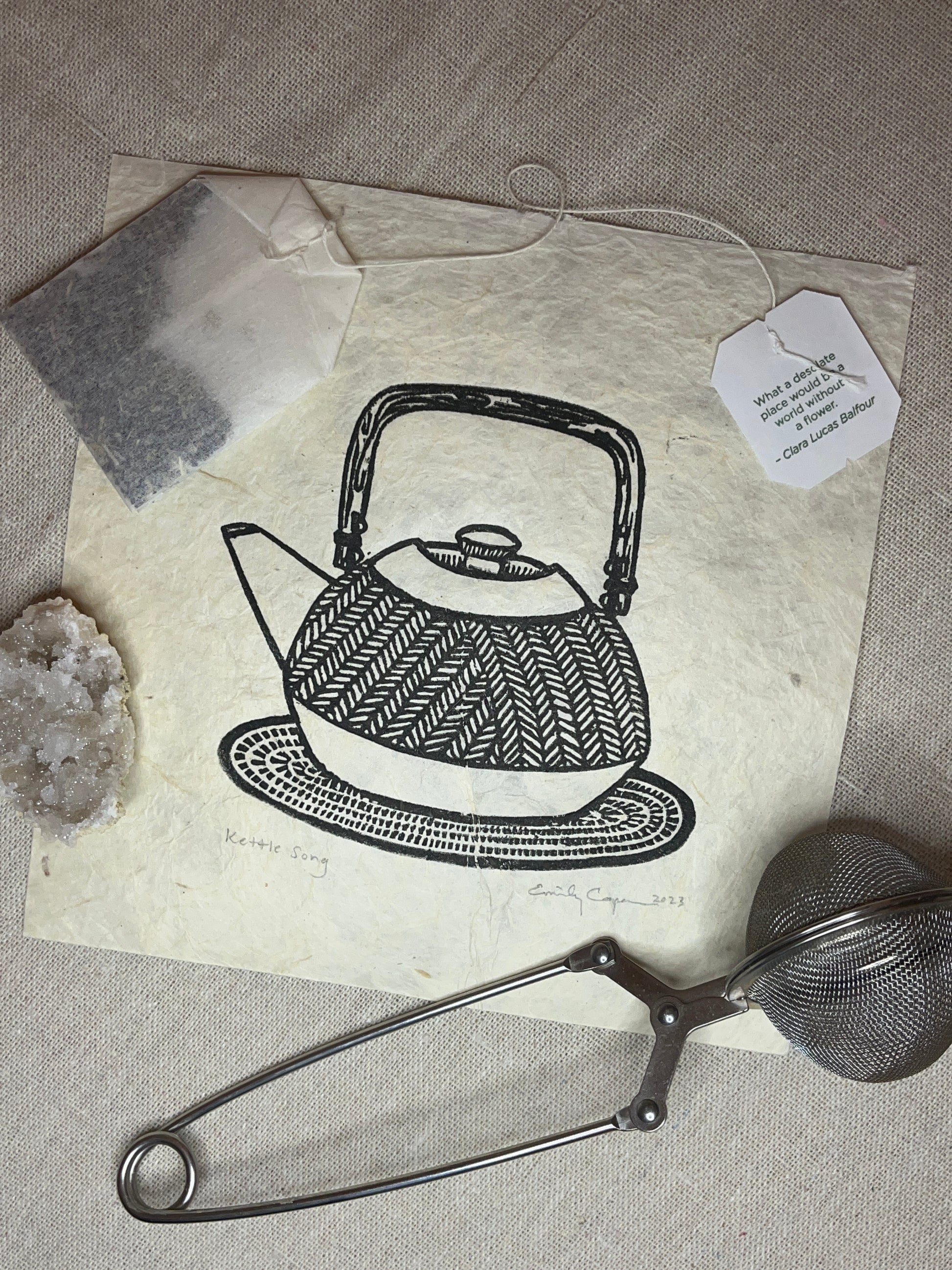 This is an open edition linoleum block print. It is printed on acid-free natural lokta paper with oil-based printmaking ink. The paper measures 6"x6".