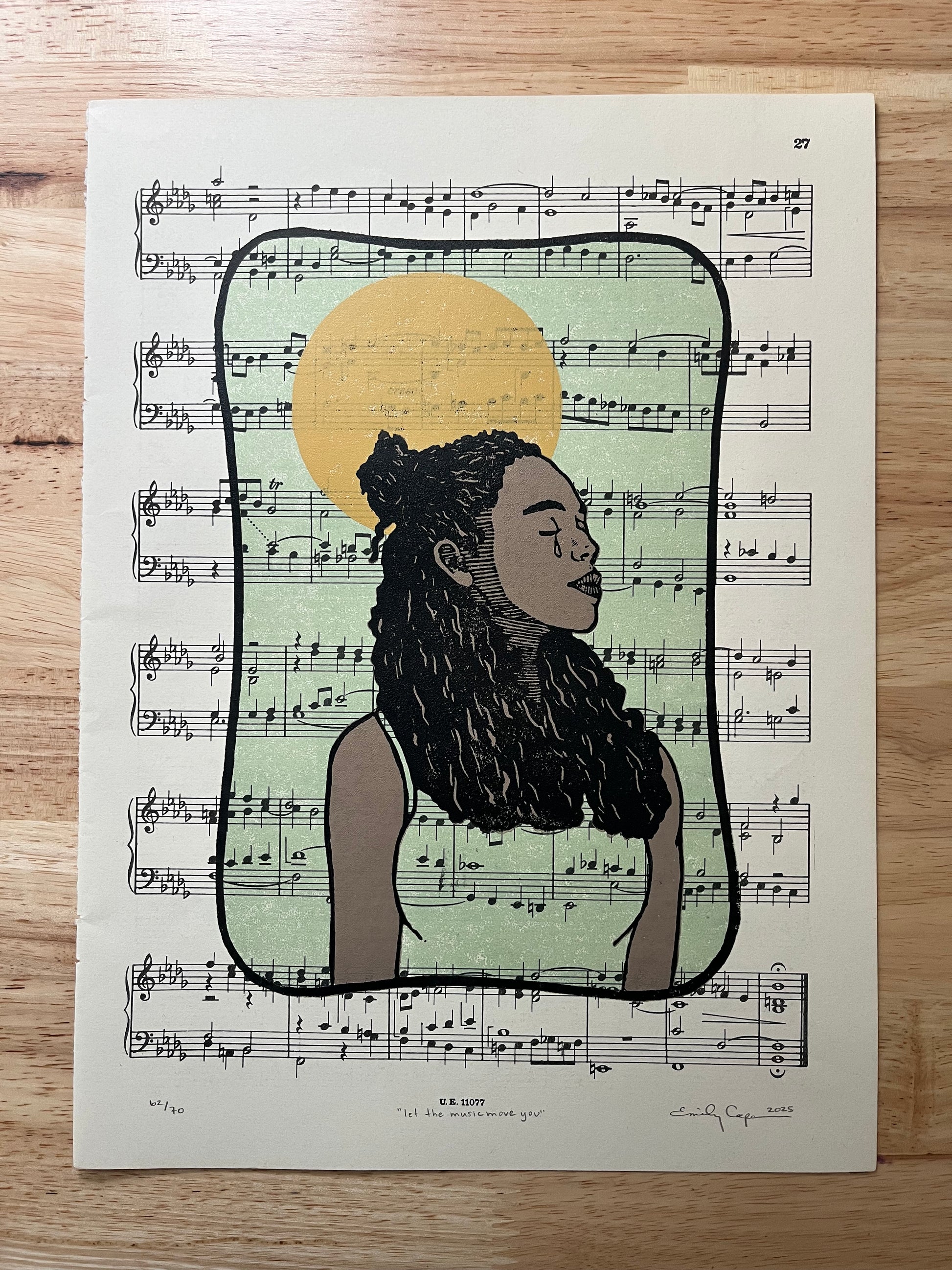 “Let the music move you” limited edition reduction linoleum block print - music sheet art