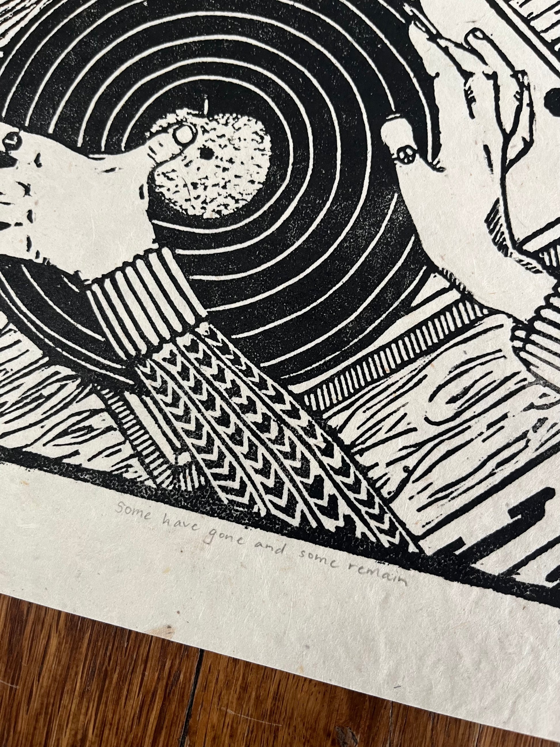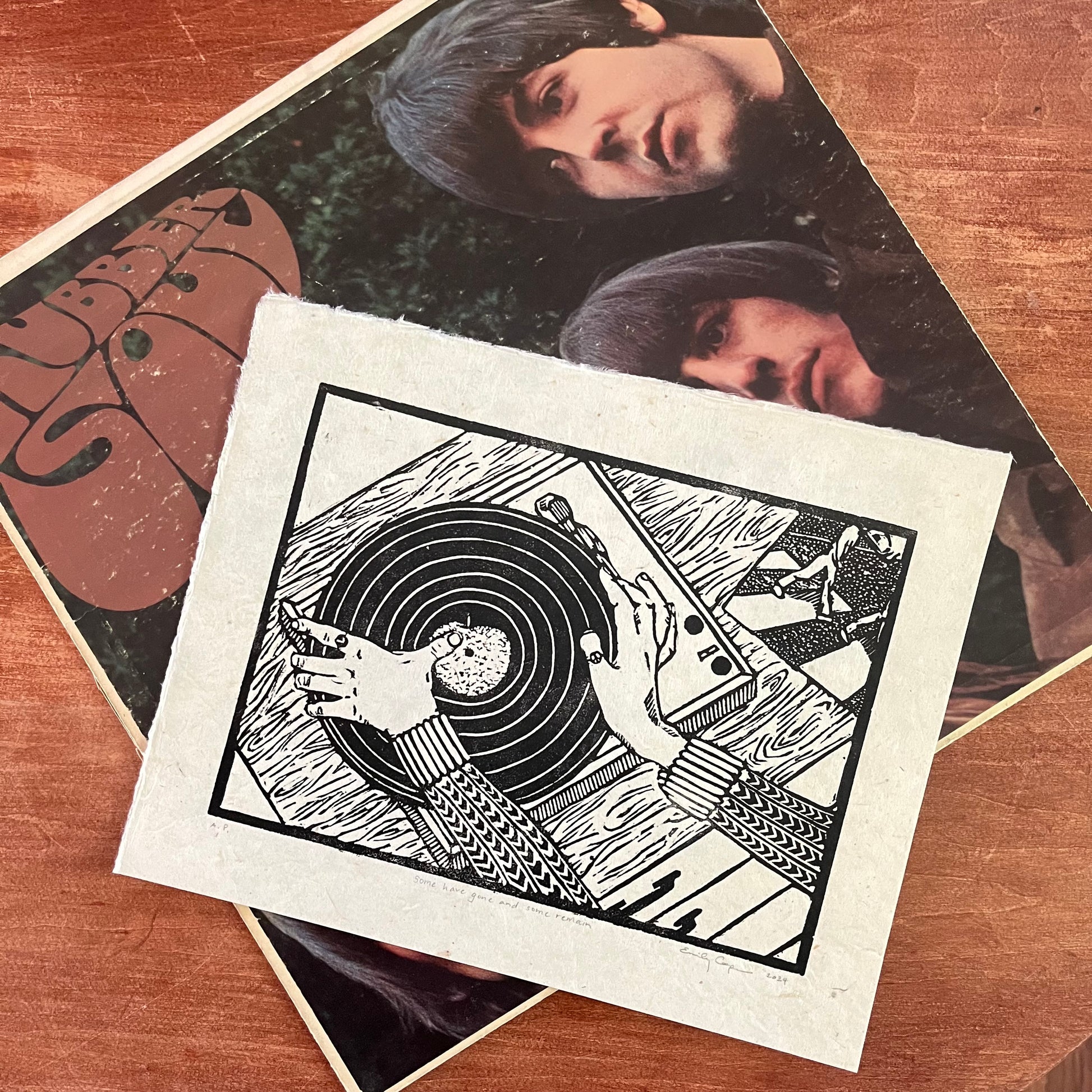 This print is a memorial print for Luke. He loved music and had an impressive vinyl collection. He was in the process of recording an album with his band before he passed. This print is a nod to The Beatles, one of Luke’s favorite bands. It features a corner of the iconic Abbey Road album cover, the apple on the center of the record represents the Beatles recording label Apple Records, and the title of the print is “some have gone and some remain,” a lyric from the song “In My Life.”
