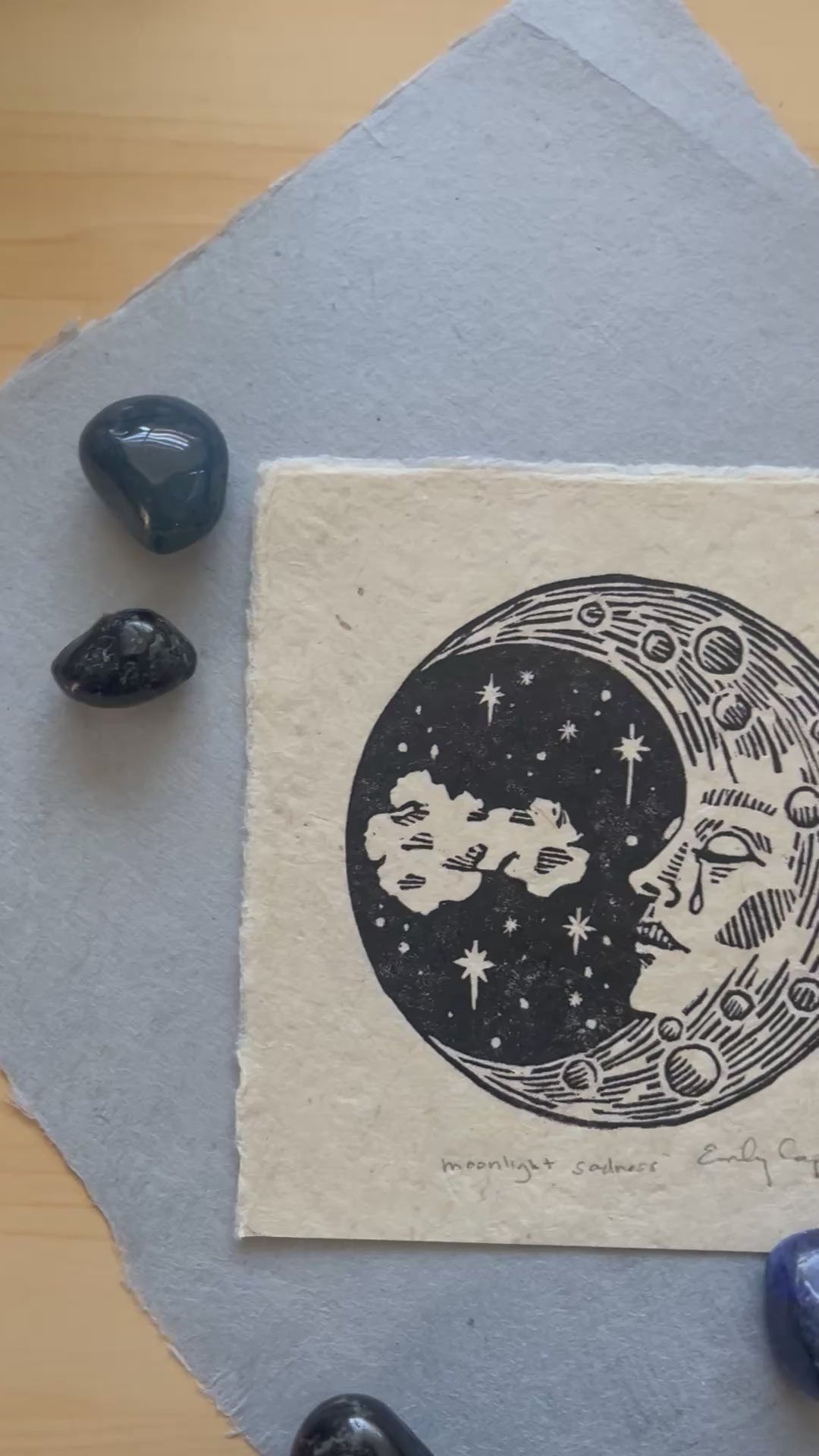 This is an open edition linoleum block print. It is printed from a hand-carved linoleum block with the use of an etching press. It is printed on Nepalese Lokta paper with black oil-based ink. Each print measures approximately 5”x5”. This is an approximation due to the deckled edges of the paper. There may be subtle differences in ink coverage compared to what is seen on the product image. Each print is unique as it is made by hand and not machine.