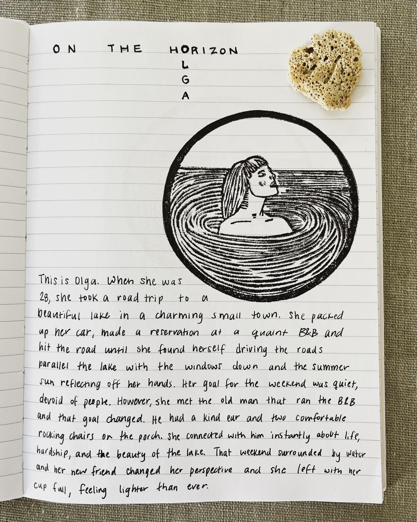 This is Olga. When she was 28, she took a road trip to a beautiful lake in a charming small town. She packed up her car, made a reservation at a quaint B&B and hit the road until she found herself driving the roads parallel the lake with the windows down and the summer sun reflecting off her hands. Her goal for the weekend was quiet, devoid of people. However, she met the old man that ran the B&B, and that goal soon changed. He had a kind ear and two comfortable rocking chairs on the porch. She connected with him instantly about life, hardship, and the beauty of the lake. That weekend, surrounded by water and her new friend changed her perspective and she left with her cup full, feeling lighter than ever.