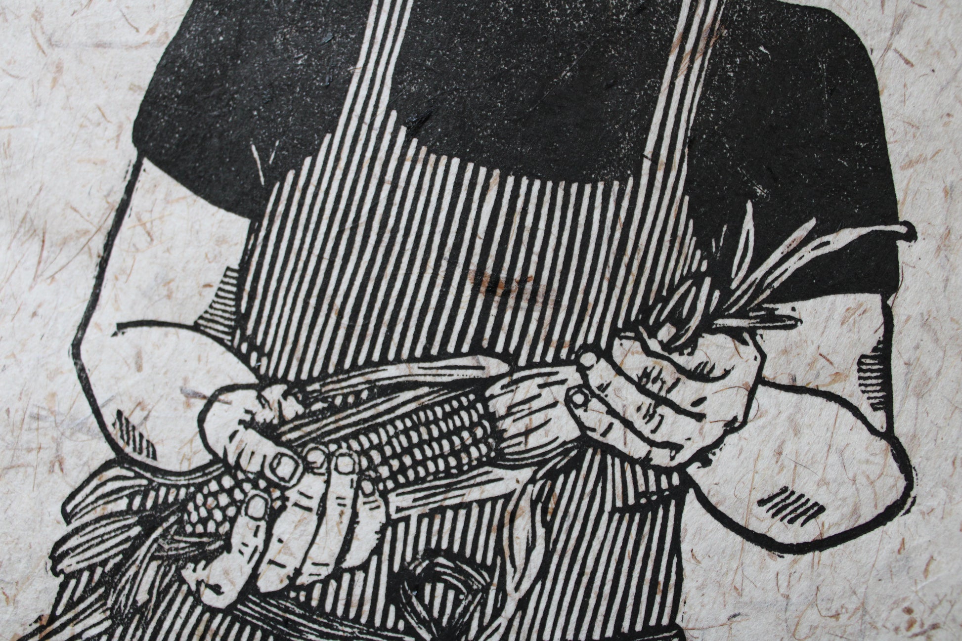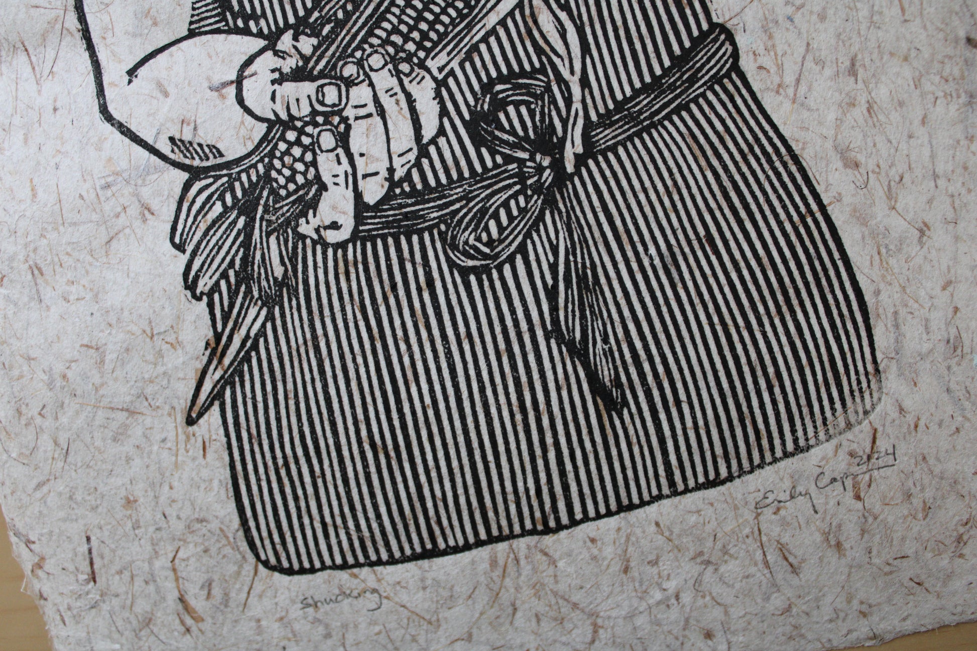 This is an open edition print featuring the hands of a person shucking corn on the cob. It is printed from a hand-carved linoleum block and oil-based ink with the use of an etching press. The paper is handmade iris leaf paper made by a papermaker in Maine. Each print measures approximately 8"x10" but may not be exact due to the nature of handmade papermaking. There may be subtle differences in ink coverage compared to what is seen on the product image. Each print is unique as it is made by hand and not machine.