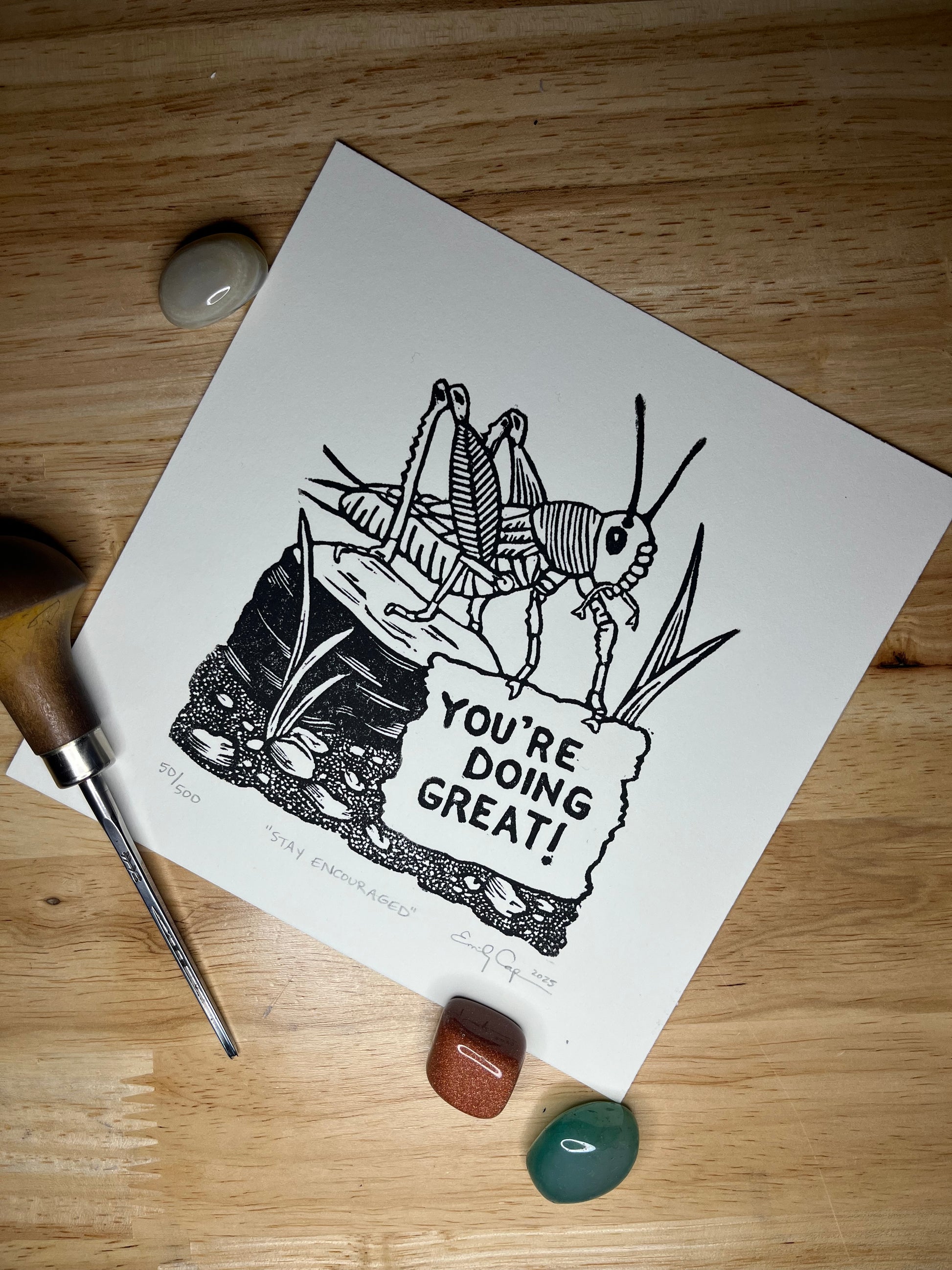 “Stay Encouraged” original linoleum block print - signed edition - cricket print