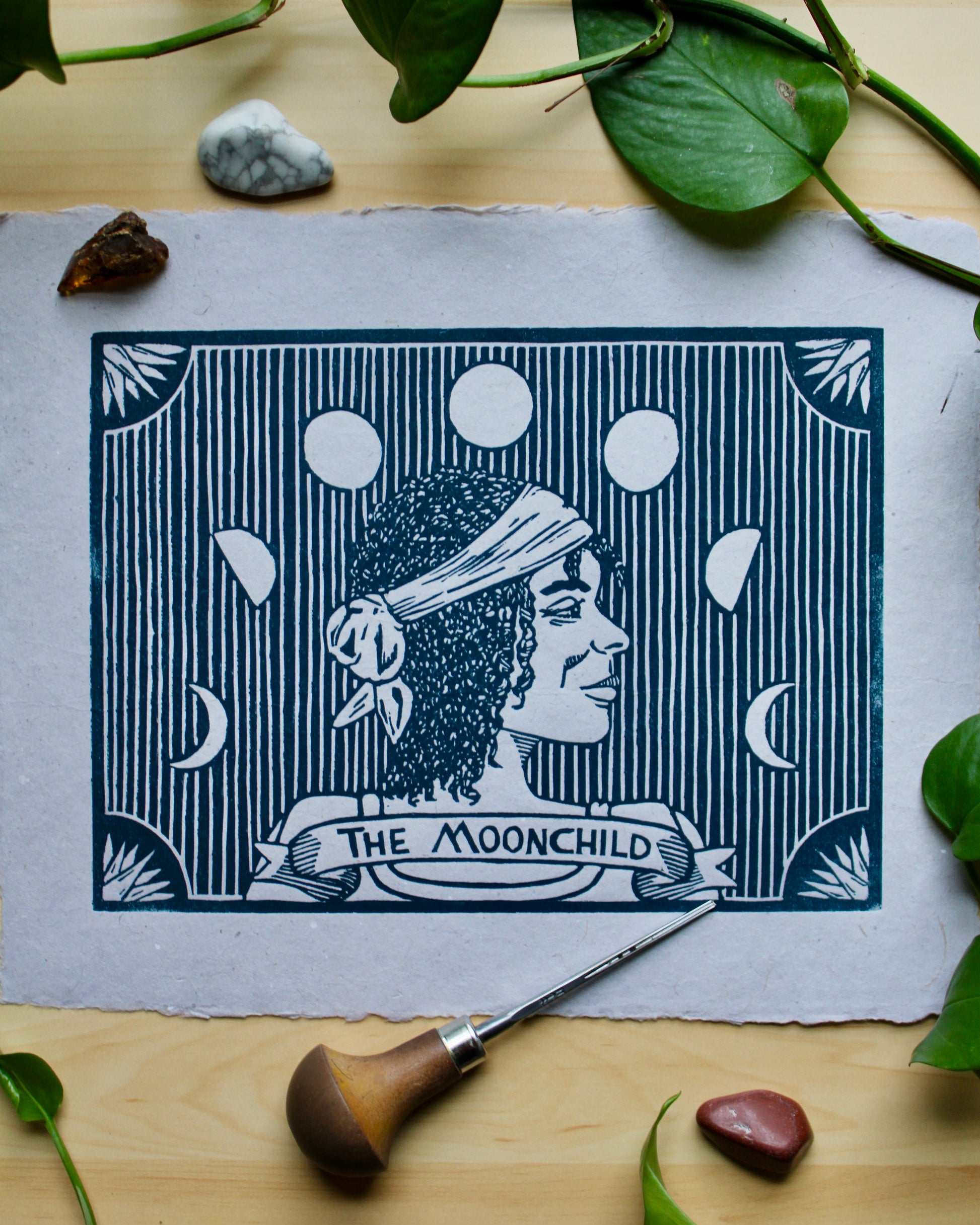This is an open edition linoleum block print featuring an original design. It is printed from a hand-carved linoleum block with the use of an etching press. It is printed on a beautifully handmade paper. Each print measures approximately 10"x8". Because of the handmade nature of the paper and the deckled edges, each print might not measure exactly 10"x8" but close enough to fit into that size frame. There may be subtle differences in ink coverage compared to what is seen on the product image. Each print is unique as it is made by hand and not machine.