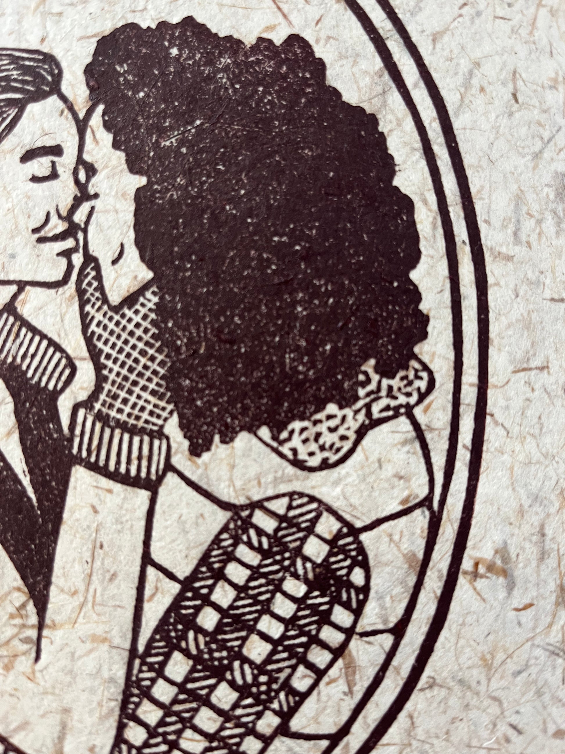 This print celebrates sapphic love. It is a limited edition of 30 prints. Each print is signed and numbered below the print. The print was made from printing a hand-carved linoleum block print onto paper with the use of an etching press. There may be subtle differences in ink coverage compared to what is seen on the product image. Each print is unique. This is printed on beautiful handmade iris leaf paper made from a papermaker located in Maine. The paper measures approximately 8"x10", but is not exact due to the nature of handmade paper.