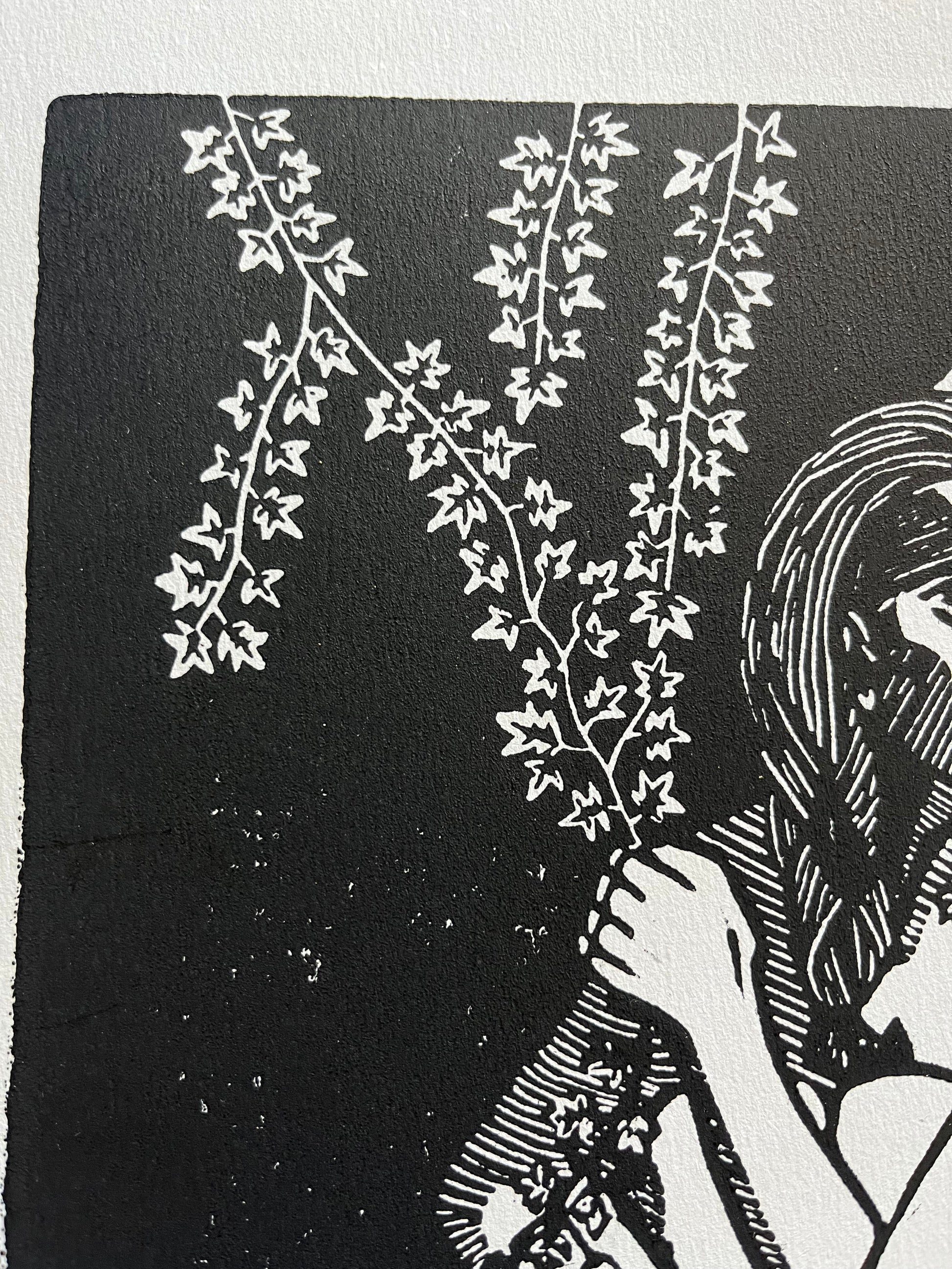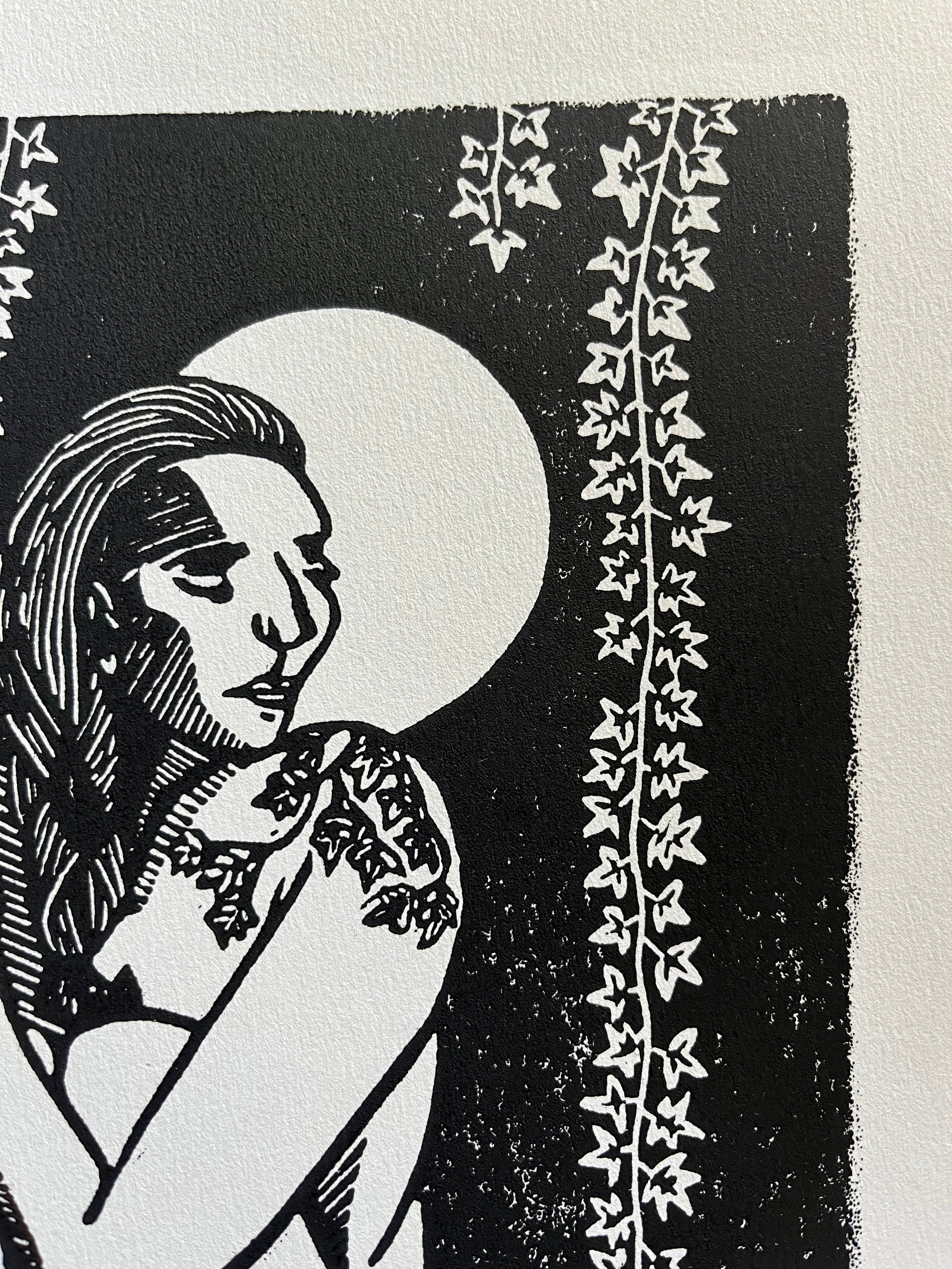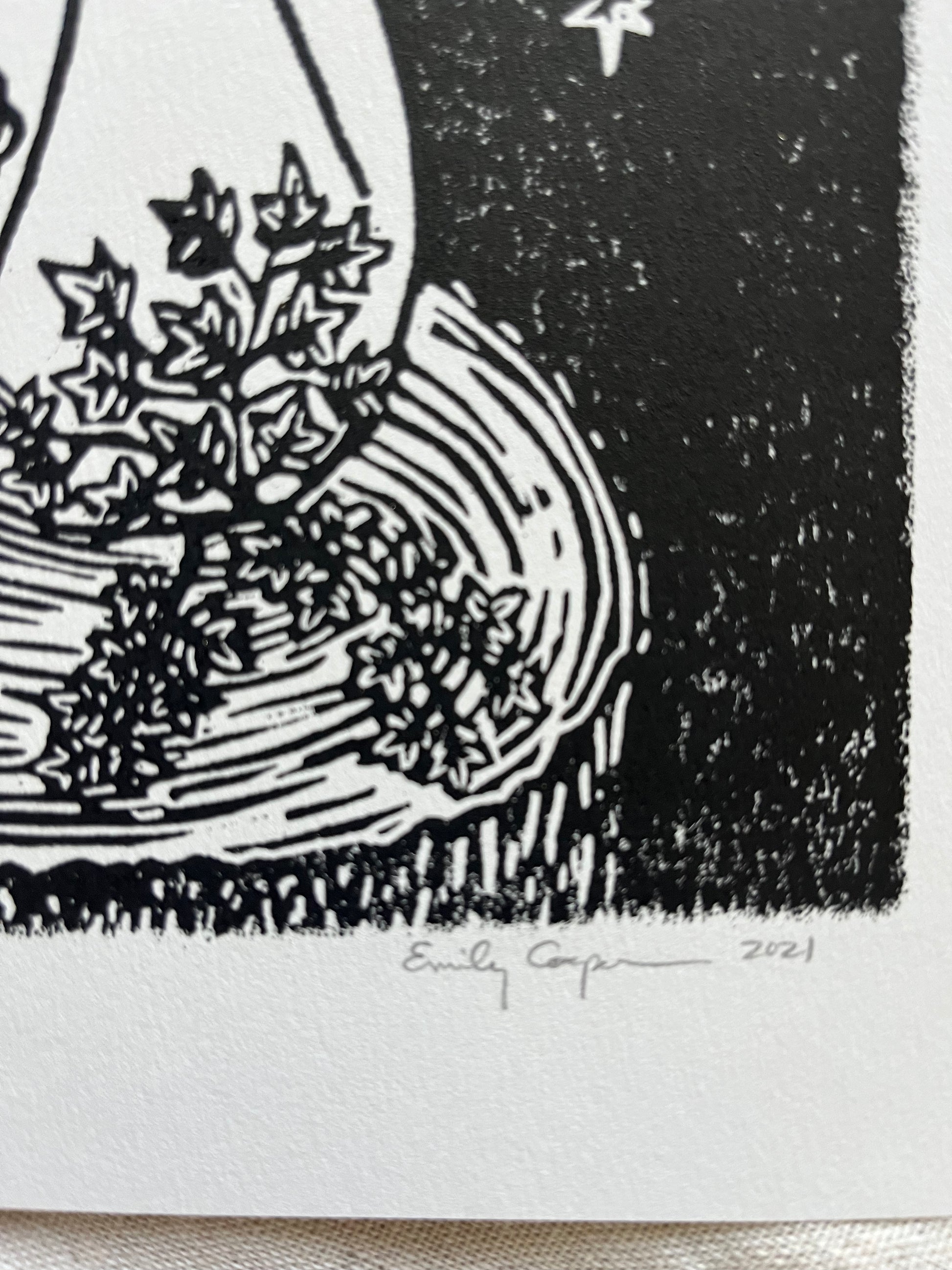 This is an open edition linoleum block print that comes signed with the title written at the bottom of the print. Each print comes on light grey acid-free paper that measure 9"x12". Because each print is printed individually, there may be subtle differences in ink coverage compared to what is seen on the product image. This means you are getting a completely original print as it was made with human hands and not by a machine.