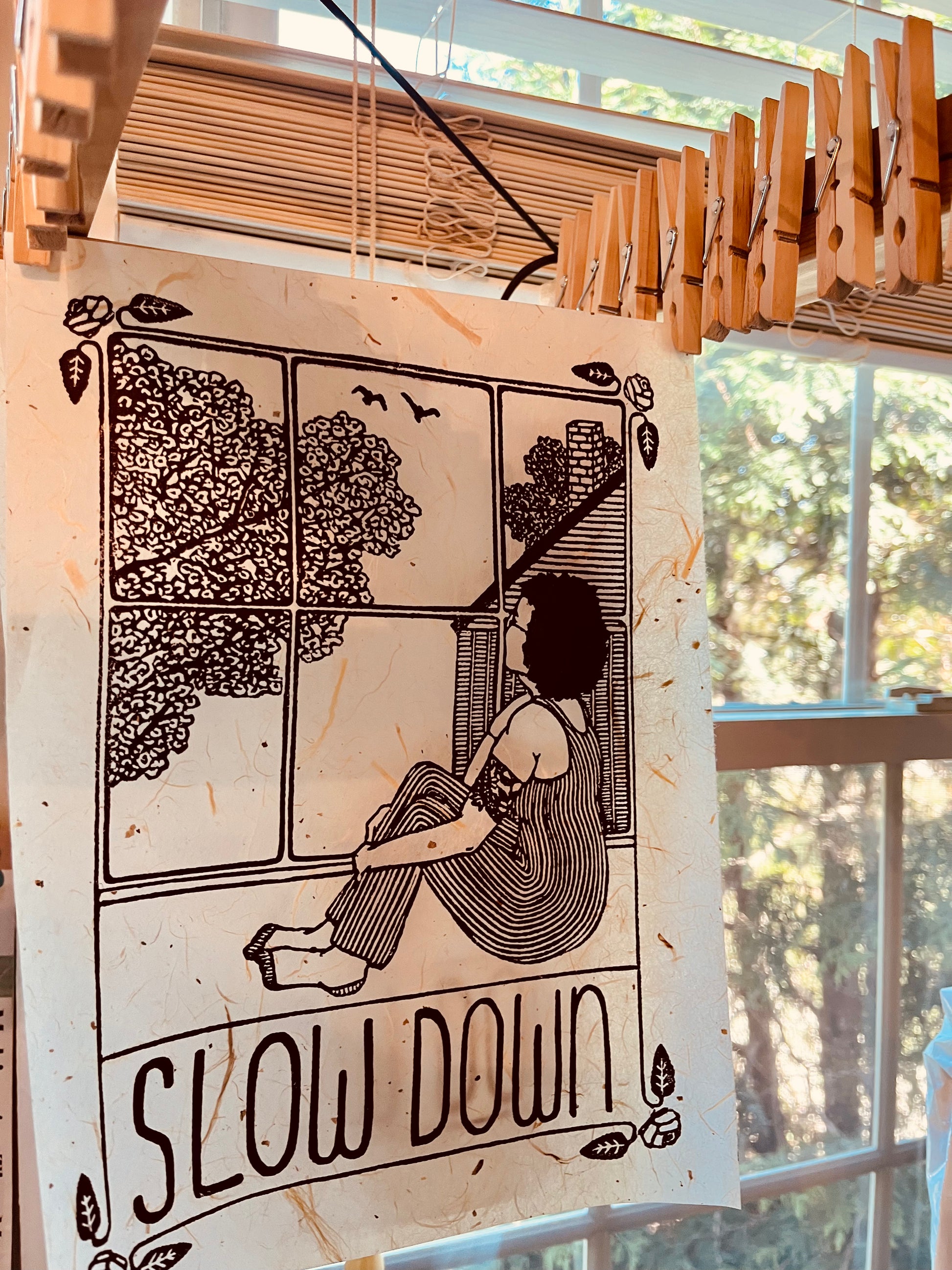 This print, entitled "You're Doing Fine," encourages the viewer to slow down and appreciate their surroundings. This is a limited edition of 25 prints. Each print is signed and numbered below the print. The print was made from hand printing a hand carved linoleum block print onto paper with the use of a wooden spoon. There may be subtle differences in ink coverage compared to what is seen on the product image. This means you are getting a completely original print as it was made with human hands and not by a machine. Each print measures 9"x12" and is printed on handmade chiri paper.